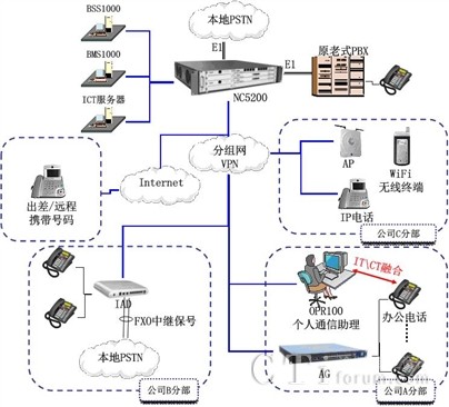 整個系統(tǒng)內(nèi)部通過主流標(biāo)準(zhǔn)協(xié)議聯(lián)結(jié),支持與運營商IMS網(wǎng)絡(luò)的無縫對接。新增分支機構(gòu)只需增加NC5200系列IP-PBX或者IAD即可融入公司整個通信系統(tǒng)。