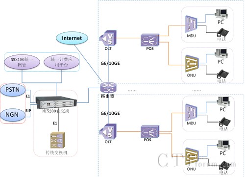 震有科技根據(jù)行業(yè)客戶的需求,推出了“NC5200系列產(chǎn)品+xPON產(chǎn)品”的行業(yè)接入網(wǎng)綜合應(yīng)用解決方案,即“NGN+xPON”行業(yè)應(yīng)用解決方案。該方案主要采用了NGN架構(gòu)的軟交換技術(shù)與xPON技術(shù)相結(jié)合,實(shí)現(xiàn)了從傳統(tǒng)的接入網(wǎng)向光纖接入網(wǎng)平滑過渡升級(jí)。該解決方案中NC5200系列產(chǎn)品主要完成語(yǔ)音交換及與語(yǔ)音相關(guān)的增值業(yè)務(wù)功能;xPON產(chǎn)品在該方案中作為語(yǔ)音、數(shù)據(jù)、視頻業(yè)務(wù)的承載平臺(tái),主要滿足了語(yǔ)音、數(shù)據(jù)及CATV或IPTV綜合業(yè)務(wù)接入要求。