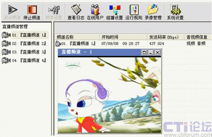 先在直播系統(tǒng)里啟動設(shè)置好的01號頻道,其他教師就可以在各自辦公室通過計算機網(wǎng)絡(luò)觀看遠(yuǎn)教節(jié)目,不需淘神費力地到專門的接收室了。如下圖: