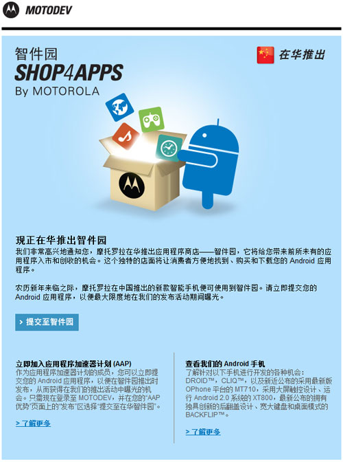 2月3日消息,摩托羅拉今日正式在華推出應(yīng)用程序商城SHOP4APPS,并取中文名為“智件園”。摩托羅拉在發(fā)給MOTODEV中國(guó)注冊(cè)會(huì)員的郵件中表示,摩托羅拉在中國(guó)推出的新款智能手機(jī)便可使用到智件園。