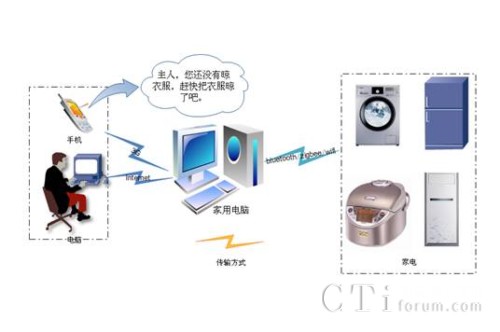 家電遠(yuǎn)控系統(tǒng)的原理是利用電腦或者手機的電源管理系統(tǒng),來管理用戶終端軟件管理電源的開關(guān)、定時、預(yù)設(shè)時間等,利用互聯(lián)網(wǎng)或者手機網(wǎng)絡(luò)把信號傳輸?shù)郊彝ル娔X,家庭電腦當(dāng)作小型服務(wù)器或者信號轉(zhuǎn)發(fā)點,把信號利用藍牙、zigbee、wifi等無線傳輸?shù)街付ǖ碾娫床遄?dāng)然每個電源插座都要有相應(yīng)的信號接收模塊實現(xiàn)和家庭電腦的信號傳輸,實現(xiàn)了對電源的管理功能。家電遠(yuǎn)控終端軟件嵌入語音合成軟件,利用合成語音報讀預(yù)設(shè)的提醒內(nèi)容和時間提醒,具有危急情況下的報警功能。當(dāng)然如果我們是在家里,可以直接用手機通過藍牙對電源插座進行管理,或者通過家庭電腦進行管理。如圖所示: