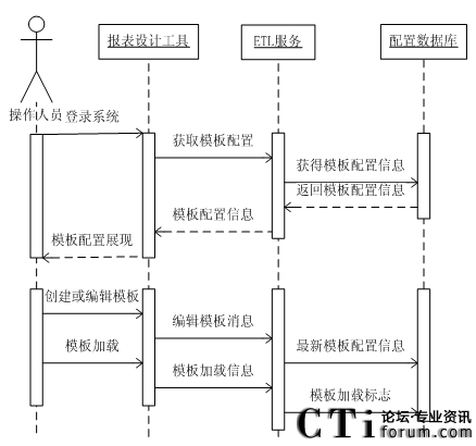 在ETL服務(wù)運行時,首先它會從配置數(shù)據(jù)庫中獲取模板的配置信息,并且根據(jù)其配置信息從ODS源數(shù)據(jù)庫中抽取數(shù)據(jù)。ODS源數(shù)據(jù)庫中的數(shù)據(jù)是狀態(tài)服務(wù)器從呼叫中心中獲得的。在ETL抽取數(shù)據(jù)后對其進(jìn)行轉(zhuǎn)換和加工,將其加載到報表數(shù)據(jù)庫中。并利用報表展現(xiàn)工具將報表數(shù)據(jù)展現(xiàn)出來。其最終設(shè)計的系統(tǒng)各部件交互時序圖如圖3.5所示。