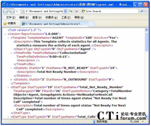 在模板導(dǎo)出的XML儲存圖中,ReportVersion屬性為報表系統(tǒng)的版本號。Template信息用來指定一個模板名字,給模板一個唯一的模板ID,再指定該模板是否激活,另外也為該模板添加了注釋。該例中是對所有坐席活動的數(shù)據(jù)進行統(tǒng)計。ObjectType為模板的統(tǒng)計類型,該模板中統(tǒng)計類型為坐席(Agent)。TimeProfile為設(shè)定收集的時間間隔,本例中為從每天的0點0分開始,每隔15分鐘收集一次。Statistic對應(yīng)了一個統(tǒng)計內(nèi)容配置,根據(jù)StatTypeID在下面將列出詳細內(nèi)容。本例中StatTypeID為19,下面的StatType中將會根據(jù)StatTypeID與之相對應(yīng),其中配置了Category,