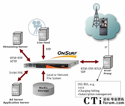 流媒體服務器(OnSurf) 使用RSTP等實時傳輸協(xié)議與客戶端進行媒體服務協(xié)商,向用戶發(fā)送媒體流,服務器同時包含語音和視頻轉碼器,用于各種音視頻媒體格式的轉換。
