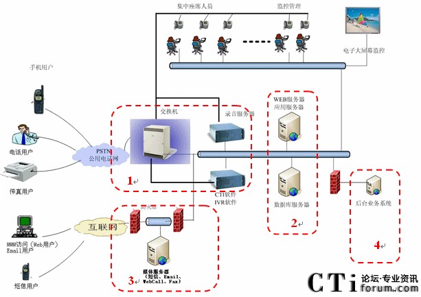 基于PBX交換機(jī)實(shí)現(xiàn)語音交換和ACD排隊、基于板卡實(shí)現(xiàn)語音資源、基于CTI中間件實(shí)現(xiàn)CallCenter功能、基于先進(jìn)技術(shù)實(shí)現(xiàn)增強(qiáng)功能,共同搭建呼叫中心平臺。