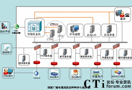 系統(tǒng)主要包含IVR服務(wù)器,CTI服務(wù)器,短信網(wǎng)關(guān),郵件服務(wù)器,傳真服務(wù)器,數(shù)據(jù)庫(kù)服務(wù)器,座席系統(tǒng)等?蛻(hù)撥打特服號(hào)碼接入廣電公司客服系統(tǒng),首先由IVR提供自動(dòng)語(yǔ)音服務(wù)。CTI服務(wù)器負(fù)責(zé)所有的電話(huà)的路由、排隊(duì)、轉(zhuǎn)接和控制。客戶(hù)在接受自動(dòng)語(yǔ)音服務(wù)時(shí),如果需要人工幫助,可選擇轉(zhuǎn)入人工座席。由IVR系統(tǒng)向CTI發(fā)出轉(zhuǎn)接請(qǐng)求,完成轉(zhuǎn)接功能。