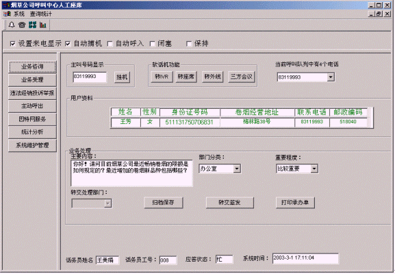 客戶打入電話后,當(dāng)系統(tǒng)的自動(dòng)語(yǔ)音應(yīng)答子系統(tǒng)無(wú)法解決客戶問(wèn)題時(shí),客戶可選擇人工服務(wù),由企業(yè)客戶服務(wù)代表直接接聽(tīng)客戶電話,處理并解決客戶問(wèn)題。此時(shí)客戶同座席話務(wù)人員直接溝通,并同時(shí)記錄下該客戶的聯(lián)系方式,將相關(guān)數(shù)據(jù)添加入系統(tǒng)數(shù)據(jù)庫(kù);也可以在數(shù)據(jù)庫(kù)的支持下回答接受查詢卷煙/價(jià)格/限額/新品種、卷煙經(jīng)營(yíng)規(guī)范制度/卷煙專賣(mài)政策法規(guī)咨詢、通報(bào)最近暢銷卷煙的限額情況/通報(bào)最近增加的新品種/煙草公司召集的活動(dòng)通知、投訴和舉報(bào)違法經(jīng)銷行為、卷煙預(yù)訂、電話訪銷、滿意度調(diào)查等。