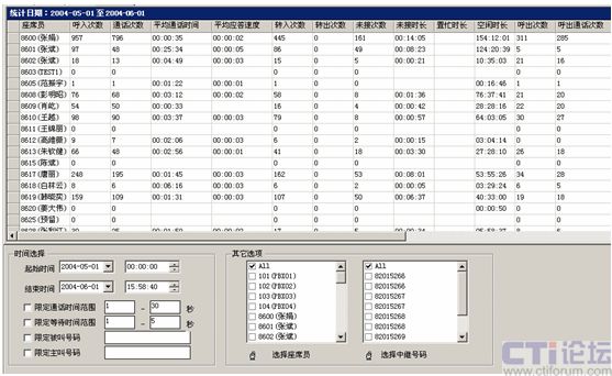 選定不同的座席員(單個(gè)或全部座席員),選定時(shí)間段內(nèi)的座席員服務(wù)指標(biāo)。