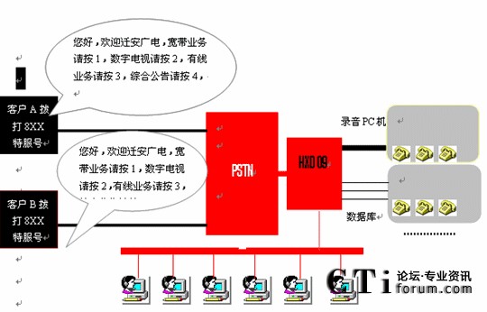 本系統(tǒng)物理結(jié)構(gòu)HXD交換機(jī)、CTI服務(wù)器、IVR(交互式語音應(yīng)答)/IFR(交互式傳真應(yīng)答)服務(wù)器、業(yè)務(wù)代表座席(邏輯上分為:普通業(yè)務(wù)代表座席、專家座席等)、班長座席、統(tǒng)計(jì)維護(hù)管理工作站、因特網(wǎng)(WEB)服務(wù)器、數(shù)據(jù)庫/應(yīng)用服務(wù)器、錄音工作站、網(wǎng)絡(luò)系統(tǒng)等構(gòu)成。