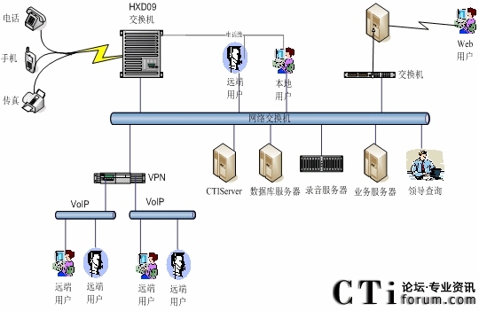 本系統(tǒng)物理結(jié)構(gòu)由交換機、CTI服務(wù)器、IVR(交互式語音應(yīng)答、服務(wù)器、業(yè)務(wù)代表座席(邏輯上分為:普通業(yè)務(wù)代表座席、專家座席等)、班長座席、統(tǒng)計維護管理工作站、因特網(wǎng)(WEB)服務(wù)器、電子郵件(EMAIL)服務(wù)器、數(shù)據(jù)庫/應(yīng)用服務(wù)器、錄音留言工作站、領(lǐng)導(dǎo)查詢工作站、業(yè)務(wù)網(wǎng)關(guān)服務(wù)器、通信網(wǎng)關(guān)、網(wǎng)絡(luò)系統(tǒng)等構(gòu)成。