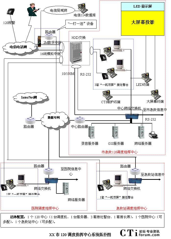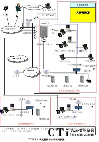- 樹立大網(wǎng)絡(luò)概念:采用先進(jìn)的通訊、計算機網(wǎng)絡(luò)技術(shù)(如CTI技術(shù)),利用現(xiàn)有的通信資源,實現(xiàn)市人民醫(yī)院120指揮中心與急救分站的計算機網(wǎng)絡(luò)及相關(guān)領(lǐng)導(dǎo)辦公室計算機大聯(lián)網(wǎng);形成全市范圍內(nèi)120有線、無線全方位立體調(diào)度語音通道大網(wǎng);為今后督查聯(lián)網(wǎng)、大聯(lián)動打下基礎(chǔ)。