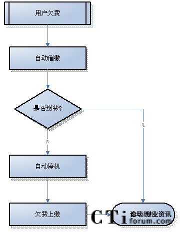 - 支持對預(yù)付費(fèi)用戶催繳:該類用戶采用先交費(fèi),后打電話,預(yù)付費(fèi)用完即視為欠費(fèi),系統(tǒng)開始催繳。一旦用戶到營業(yè)窗口補(bǔ)交話費(fèi),系統(tǒng)即停止催繳;