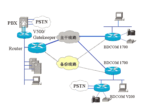 500作為Gatekeeper的Server端,V 200 作為Client端,實現(xiàn)語音和數(shù)據(jù)集成應(yīng)用。
