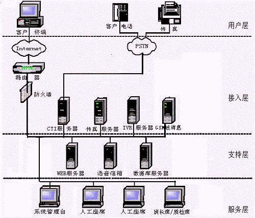 CTI服務器、IVR/FAX服務器、人工座席、管理工作站(計費、統(tǒng)計、系統(tǒng)管理、網絡管理)、數據庫服務器、WWW服務器、網絡系統(tǒng)等,其網絡結構圖如下: