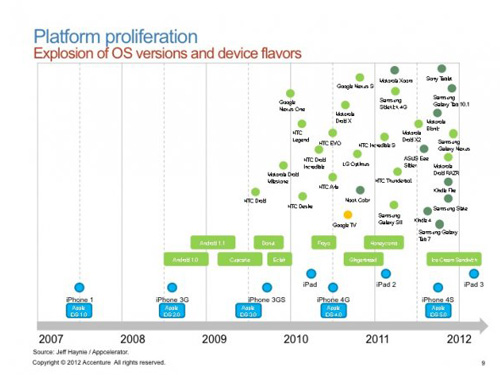 蘋果的iPhone開啟了智能手機(jī)的革命,并且很快獲得了消費(fèi)者的青睞,但是Android平臺(tái)正以一個(gè)更快的速度蔓延世界。在上個(gè)月的世界移動(dòng)大會(huì)上,Accenture的分析師 Lars Kamp分享了一份非常有參考價(jià)值的研究報(bào)告,揭示了移動(dòng)世界的未來趨勢(shì)。我們從中摘取了9幅數(shù)據(jù)圖供您參考:
