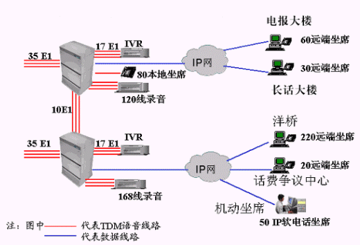 E1數(shù)字中繼(2100路),提供34E1(1020路) IVR自動語音服務(wù),510個人工坐席其中本地80個,遠(yuǎn)端360個,機(jī)動座席50個。提供全程錄音跟蹤。