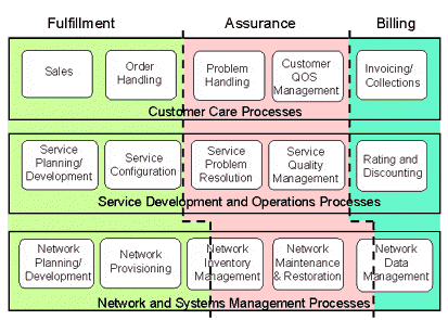 在TMF的模型中,從功能上來看,OSS主要包括三大功能:業(yè)務(wù)開通(Service Fulfillment);業(yè)務(wù)保障(Service Assurance);計費,又稱業(yè)務(wù)計量(Service