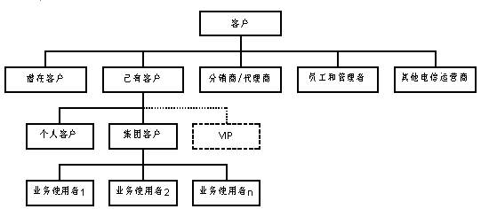同時,客戶服務(wù)中心的服務(wù)對象進一步擴大,按照是否已經(jīng)使用該電信運營商提供的電信業(yè)務(wù)將客戶劃分為:潛在客戶、已有客戶。這里的潛在客戶并不針對某一具體的電信業(yè)務(wù),而是針對電信運營商整體而言。其中,已有客戶又分為個人客戶和集團客戶。集團客戶內(nèi)部存在多個業(yè)務(wù)使用者,這些業(yè)務(wù)使用者本身也是客服系統(tǒng)的客戶。分銷/代理商代為發(fā)展電信運營商的客戶,同時他們也可以單獨作為一種特殊客戶享有客服系統(tǒng)提供的服務(wù)。在個人客戶和集團客戶中,均會有一部分成為特殊的VIP。此外,對客服系統(tǒng)來說,電信運營商的員工和管理者也是"客戶";同時,從網(wǎng)間互聯(lián)和網(wǎng)間結(jié)算的角度,其它運營商也應(yīng)該按照客戶來對待。