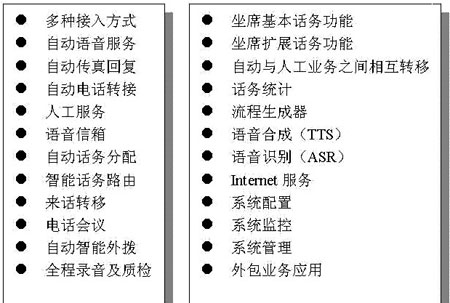 1. 接入及交換處理系統(tǒng)。此部分重點(diǎn)考慮用戶的呼叫接入和呼出、呼叫轉(zhuǎn)接處理需求,分析提供電話、傳真、信函、Web、E-mail、WAP、短信、視頻等方式的接入選擇。考慮分析用戶呼叫要求和數(shù)據(jù),將該數(shù)據(jù)傳遞給業(yè)務(wù)處理和業(yè)務(wù)管理系統(tǒng),同時(shí)接收業(yè)務(wù)處理和業(yè)務(wù)管理系統(tǒng)的交換請(qǐng)求,對(duì)各種電話交換資源、語(yǔ)音資源、傳真資源、坐席資源等進(jìn)行統(tǒng)一管理和調(diào)度分配,進(jìn)行呼叫的排隊(duì)和交換。它包括PBX/ACD (自動(dòng)呼叫分配)、IVR(交互語(yǔ)音應(yīng)答)、CTI、傳真系統(tǒng)、短信平臺(tái)、坐席軟電話、錄音、呼出系統(tǒng)、ICC(Internet呼叫中心)等子系統(tǒng)。