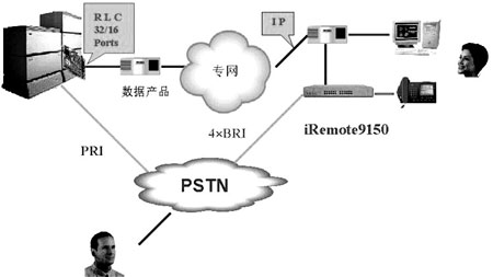 在iRemote遠(yuǎn)端坐席實(shí)現(xiàn)方式中,系統(tǒng)采用的遠(yuǎn)端語(yǔ)音模塊iRemote9150由安裝在M1內(nèi)的MIG RLC卡板和遠(yuǎn)端單元iRemote9150組成。MIG RLC卡板通過(guò)10BASE-T以太網(wǎng)接口與路由器相連。iRemote單元既可通過(guò)10BASE-T以太網(wǎng)接口與路由器相連,也可以以ISDN BRI方式與PSTN相連,每個(gè)遠(yuǎn)端單元最多提供4個(gè)BRI接口,32個(gè)數(shù)字話機(jī)接口,一個(gè)用于傳真的模擬端口。每塊MIG RLC卡板有一DSP模塊,可同時(shí)處理8路語(yǔ)音,通過(guò)在MIGLC板上增加3塊DSP模塊,最多可同時(shí)處理32路話音。IP網(wǎng)上的話音符合UDP/IP協(xié)議,話機(jī)狀態(tài)控制信號(hào)符合TCP/IP協(xié)議。同一遠(yuǎn)端單元間的兩用戶通話無(wú)需占用M1帶寬。