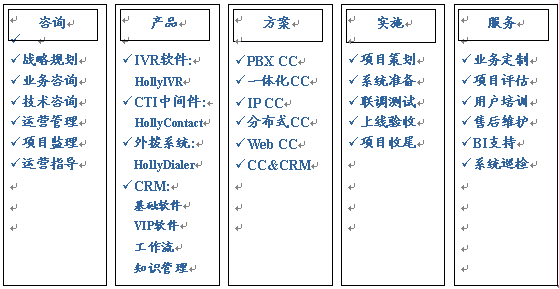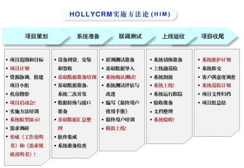 HOLLYCRM(合力金橋軟件)公司是國(guó)內(nèi)最早從事呼叫中心應(yīng)用軟件開(kāi)發(fā)與服務(wù)公司,在多年的實(shí)踐經(jīng)驗(yàn)基礎(chǔ)上形成了完整的“456”呼叫中心“項(xiàng)目實(shí)施方法論”(HIM:HOLLYCRM Implementary Methodology),即“四大實(shí)施策略、五個(gè)項(xiàng)目階段、六大管理專(zhuān)題”。該體系的有效運(yùn)行對(duì)公司項(xiàng)目的成功上線(xiàn)和推進(jìn)軟件產(chǎn)品的成熟將起到至關(guān)重要的作用。