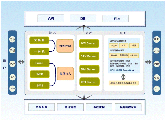 HollyC&C不僅支持電話(huà)、傳真、短信、Email、Web多媒體溝通渠道的統(tǒng)一接入和管理,還具有強(qiáng)大的業(yè)務(wù)整合接口,能夠幫助企業(yè)實(shí)現(xiàn)呼叫中心與企業(yè)其它信息系統(tǒng):如辦公OA、ERP、SCM、財(cái)務(wù)等系統(tǒng)的接口和工作流程整合。