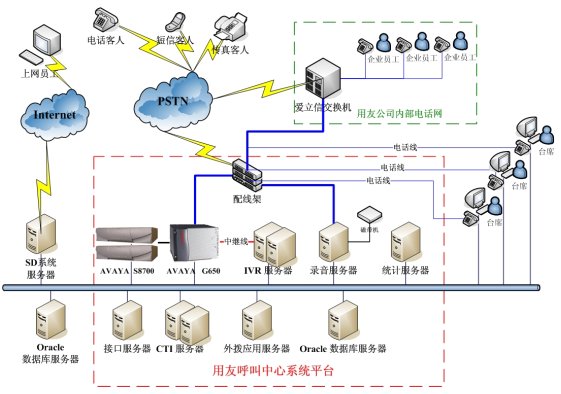 HollyContact(CTI中間件)等,搭建了一個(gè)為用友用戶進(jìn)行軟件應(yīng)用技術(shù)咨詢、軟件產(chǎn)品咨詢、軟件購買咨詢、故障受理、服務(wù)投訴、滿意度調(diào)查、客戶關(guān)懷等內(nèi)容的支撐系統(tǒng)。