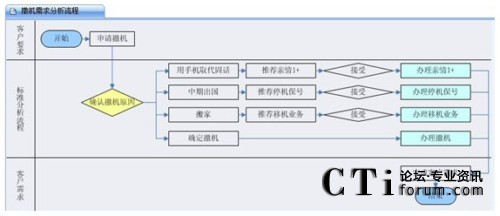 客戶呼入之后,座席人員要做的第一件事情就在IT系統(tǒng)的支持下先去捕獲客戶訴求,不用擔(dān)心座席會(huì)混淆相似的業(yè)務(wù)類型,因?yàn)楹艚兄行尼槍?duì)典型的業(yè)務(wù)訴求會(huì)做出非常詳盡的引導(dǎo)流程,相似的或者關(guān)聯(lián)的業(yè)務(wù)類型在此流程中會(huì)體現(xiàn)出來,座席人員可以點(diǎn)擊,快捷地出入于各業(yè)務(wù)類型的引導(dǎo)圖,通過比較、判斷,最終定位出客戶真正訴求。例如下文客戶呼入本來想做“撤機(jī)”業(yè)務(wù),通過業(yè)務(wù)引導(dǎo)圖,最終定位到了客戶的真正訴求,辦理了停機(jī)保號(hào)業(yè)務(wù)或者移機(jī)業(yè)務(wù)。