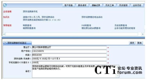 要實(shí)現(xiàn)此目的,IT支撐系統(tǒng)將高技能座席的處理能力“推送”給普通座席。第一章我們論述了IT支撐系統(tǒng)可以以客戶應(yīng)用場景為核心,通過分析流程分析客戶訴求找到客戶真正的需求?梢詫⑦@一思路推演下去,針對(duì)客戶的某個(gè)具體需求,呼叫中心制定統(tǒng)一的解決方案。我們以下面的“預(yù)存話費(fèi)換手機(jī)”為案例。通過先期溝通,座席已經(jīng)知曉這是客戶的真正訴求,只需要選擇好“預(yù)存話費(fèi)換手機(jī)”的業(yè)務(wù)類型,IT支撐系統(tǒng)會(huì)顯示出集成在一個(gè)頁面中的全套解決方案:處理此訴求可能用到知識(shí)庫中的三個(gè)知識(shí)點(diǎn);需要查詢的客戶信息,經(jīng)常給客戶發(fā)送的短信內(nèi)容;處理此訴求可能執(zhí)行的登記任務(wù),……