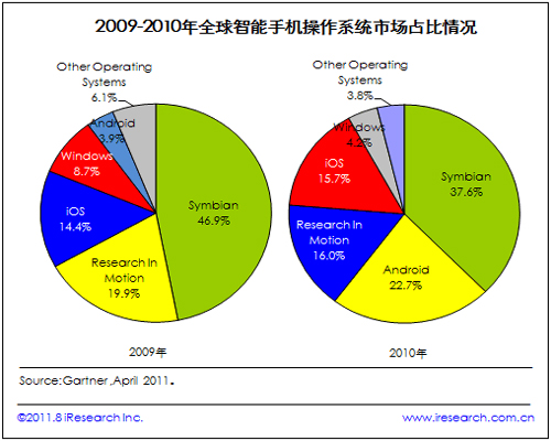 根據(jù)Gartner最新發(fā)布的數(shù)據(jù)可以看到,智能手機(jī)操作系統(tǒng)市場(chǎng)占比情況從2009年到2010年變化很大,Symbian仍然是占比最大的操作系統(tǒng),但是,其下降趨勢(shì)可見(jiàn)一斑。而Android和iOS則快速增長(zhǎng),2010年Android以22.7%的市場(chǎng)份額位列第二。經(jīng)過(guò)2011年的發(fā)展,這一市場(chǎng)格局還將有新的變化。