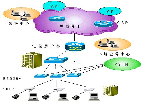 在用戶接入層Quidway S3026V提供24路VDSL接入,在普通雙絞線上提供12Mbps的雙向?qū)ΨQ數(shù)據(jù)業(yè)務(wù),傳輸距離最大可達(dá)1500m,在完成以太網(wǎng)接入的同時,不影響POTS業(yè)務(wù)。S3026V上行FE接口直接接入L3交換機(jī)。同時,通過雙絞用戶線完成了與PSTN交換機(jī)的相連,將寬帶、窄帶業(yè)務(wù)在S3026V上匯合,并通過已有雙絞電話線連接至遠(yuǎn)端用戶設(shè)備(1805)。1805可以通過五類線與計算機(jī)網(wǎng)卡相連。