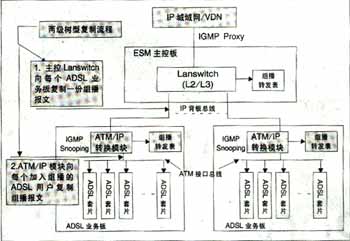 可實現高效的兩級組播;诳臻g總線上的組播信元技術實現,與組播用戶數無關,同一節(jié)目即使所有用戶加入該頻道,僅需復制一份,不用逐個用戶復制到每個用戶端口,極大節(jié)省了背板帶寬,減輕IP上行負擔?蓪崿F高性能硬件組播轉發(fā)。IP上行板采用超大規(guī)模FPGA硬件邏輯處理組播報文,ADSL板采用空間組播處理硬件芯片自動完成向每個ADSL端口(用戶)的組播復制,每ADSL端口組播帶寬6M。