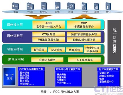 IPCC(IP聯(lián)絡(luò)中心IP Contact center)是針對(duì)金融、政府、IT和電子商務(wù)、物流、制造、緊急救援等行業(yè)的特點(diǎn),推出的一體化多媒體聯(lián)絡(luò)中心解決方案。結(jié)合電話、FAX、E-mail、Web、視頻、短信等多種通訊手段,建立客服、銷售及市場(chǎng)推廣的高效溝通渠道。