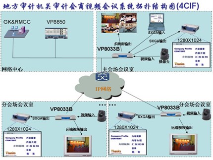 本系統(tǒng)在審計(jì)署機(jī)房配置網(wǎng)絡(luò)控制中心GK、多點(diǎn)資源管理系統(tǒng)和ViewPoint 8660 MCU設(shè)備。多點(diǎn)資源管理中心實(shí)現(xiàn)對MCU、電視會議和全網(wǎng)資源的統(tǒng)一調(diào)度,GK實(shí)現(xiàn)對IP終端入會時(shí)鑒權(quán)認(rèn)證,在主會場會議室架設(shè)一臺ViewPoint 8033B分體式視訊終端。在各分會場會議室架設(shè)一臺ViewPoint 8033B分體式視訊終端;在所有會場各架設(shè)一臺標(biāo)清攝像機(jī)、一個麥克風(fēng)、一臺高清電視或一臺高清投影機(jī)。