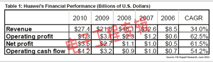 華為已經取得了強大的地位,國內外銷售均快速增長。該公司過去四年營業(yè)收入增長了兩倍以上,2010年營業(yè)收入從2006年的85億美元上升到274億美元。