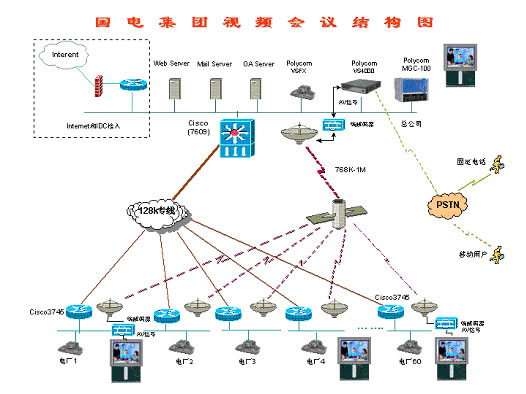 128,集團(tuán)下屬60個(gè)電廠均采用視頻終端ViewStation 128。整個(gè)網(wǎng)絡(luò)采用Polycom MCU的混速功能,在本部中心采用768Kbps進(jìn)行視頻傳輸,和下屬60個(gè)電廠及分公司采用128Kbps進(jìn)行傳輸。由于網(wǎng)絡(luò)傳輸線路分為衛(wèi)星線路和地面有線網(wǎng)絡(luò),衛(wèi)星線路帶寬為768Kbps-1Mbps,用于業(yè)務(wù)下行線路,地面有線網(wǎng)絡(luò)128Kbps用于視頻回傳。根據(jù)網(wǎng)絡(luò)傳輸線路的實(shí)際情況,在本部中心利用1臺(tái)視頻終端將其模擬信號(hào)(AV信號(hào))送到衛(wèi)星端接設(shè)備(包含MODEM,編解碼器等),將模擬信號(hào)轉(zhuǎn)換成數(shù)字信號(hào)(MPEG4),利用768K-1Mbps衛(wèi)星線路廣播到每個(gè)接收點(diǎn),通過(guò)每個(gè)接收點(diǎn)的編解碼器將數(shù)字信號(hào)轉(zhuǎn)換成模擬信號(hào)連接到顯示終端(如TV、顯示器)上進(jìn)行收看,通過(guò)這種方式可以實(shí)現(xiàn)利用衛(wèi)星線路的高帶寬,并利用其廣播特性,節(jié)省投資。