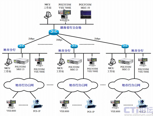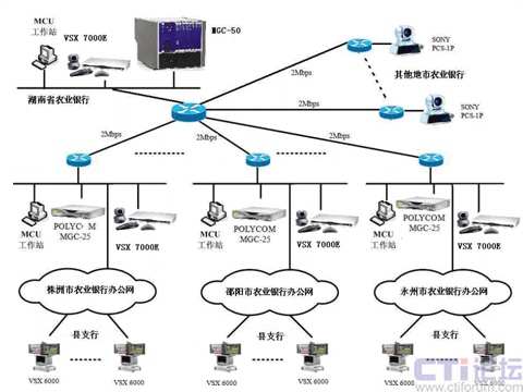 在株洲、邵陽和永州市行采用級聯(lián)的方式來實(shí)現(xiàn)。具體實(shí)現(xiàn)方式為:VSX 7000E則和地市行的MGC-25通訊,并且MGC-25負(fù)責(zé)其縣支行終端的接入,同時(shí)用MGC-50和MGC-25的端口級聯(lián),采用這種連接方式就可以實(shí)現(xiàn)從省行-地市行-縣支行的三級網(wǎng)視頻會議的召開。
