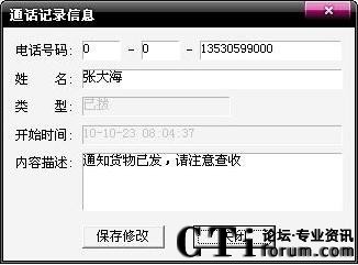 在A8電腦傳真機(jī)的電話(huà)商務(wù)通軟件主界面,雙擊通話(huà)記錄中的某個(gè)客戶(hù)號(hào)碼,或選中該號(hào)碼點(diǎn)擊下面的通話(huà)歷史按鈕,您與該客戶(hù)的通話(huà)歷史便一覽無(wú)余。選中某個(gè)記錄,您可以對(duì)其進(jìn)行編輯(添加姓名、備注該次通話(huà)的內(nèi)容),刪除,軟件撥出,加入電話(huà)簿等操作。