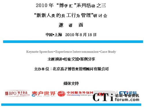 宣傳廣泛:除了易才博普奧《電子雜志》外,我們還與《呼叫中心觀察網(wǎng)》、《客戶世界》、《CTI論壇》、《中國服務(wù)外包網(wǎng)》等專業(yè)權(quán)威媒體充分合作,在會(huì)前、會(huì)后對(duì)本次大會(huì)進(jìn)行廣泛宣傳和報(bào)道。