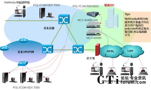 京東商城的NetMedia軟視頻會議MCU設(shè)備MCV8000N安裝在聯(lián)通的IDC,有10個倉儲的網(wǎng)絡(luò)視頻會議室安裝硬件終端MCV2000N,另外40個倉儲是在網(wǎng)絡(luò)視頻會議室的PC機(jī)上安裝一套NetMedia客戶端程序,各會議室終端通過ADSL撥號、3G無線上網(wǎng)、公司VPN專網(wǎng)等方式接入NetMedia軟視頻會議MCU。該系統(tǒng)以良好的網(wǎng)絡(luò)適應(yīng)性運(yùn)行在互聯(lián)網(wǎng)上,可保證音視頻低延時、高保真的交互,使各倉儲間的技術(shù)交流和庫存數(shù)據(jù)交換常態(tài)化,為各地倉儲間庫存數(shù)據(jù)交換、貨物調(diào)配提供了實(shí)時、快捷的溝通渠道。