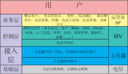 依靠五岳鑫公司強大的技術優(yōu)勢和對增值業(yè)務的深刻理解,以我公司自主研發(fā)的具有國際先進水平的語音板卡為基礎,為廣大增值業(yè)務服務商提供的語音增值業(yè)務綜合平臺,將種類繁多的語音增值業(yè)務融合在一個系統(tǒng)平臺中。不僅支持行業(yè)內(nèi)大多數(shù)的語音增值業(yè)務,還能方便、快速地面向市場提供各種的語音增值業(yè)務。