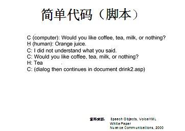 世界上最古老的用戶界面--人類語(yǔ)言終于在二十一世紀(jì)借助于VoiceXML,一種語(yǔ)音可擴(kuò)展標(biāo)記語(yǔ)言發(fā)展成熟起來(lái)。作為世界上第一個(gè)真正的語(yǔ)音通信標(biāo)準(zhǔn),它定義了應(yīng)用開(kāi)發(fā)商向用戶提供新型信息訪問(wèn)服務(wù)的方式。通過(guò)這種服務(wù),用戶在任何地方,都可以通過(guò)電話或任何移動(dòng)設(shè)備,虛擬訪問(wèn)任何信息。VoiceXML正在被廣泛應(yīng)用于旅游、金融與信息服務(wù)等行業(yè)的各種業(yè)務(wù)領(lǐng)域中,甚至是政府部門與市政機(jī)構(gòu),全球的無(wú)線運(yùn)營(yíng)商等。