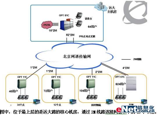 新的網(wǎng)絡(luò)建成以遠(yuǎn)大路中心機(jī)房為核心的星形網(wǎng)絡(luò),租用北京網(wǎng)通2M專線的方式同各個(gè)門市店連接。各個(gè)門市店設(shè)立了自己的程控交換機(jī),并通過E1中繼方式和核心機(jī)房實(shí)現(xiàn)全網(wǎng)互聯(lián)。在此方案中,所有的市話呼入和呼出都通過核心節(jié)點(diǎn)同網(wǎng)通之間的中繼通道,從而實(shí)現(xiàn)大中電器內(nèi)部話音通訊的統(tǒng)一編號(hào)方案、統(tǒng)一撥號(hào)規(guī)則、統(tǒng)一維護(hù)和管理;并對(duì)外公布公開和便于記憶的號(hào)碼,以配合網(wǎng)點(diǎn)的促銷活動(dòng),以及未來(lái)客戶服務(wù)等應(yīng)用的擴(kuò)展。