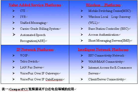 標(biāo)準(zhǔn)之眾多解決方案,使設(shè)備供貨商與服務(wù)供貨商能根據(jù)自己需要,結(jié)合IP、ATM、IN、TDM眾家之長,建設(shè)開放式電信等級(jí)的寬頻網(wǎng)絡(luò)架構(gòu),不但降低網(wǎng)絡(luò)建設(shè)及運(yùn)行維護(hù)成本,更能快速提供新加值服務(wù)、搶占新市場、滿足用戶不斷變化的需求。CompactPCI寬頻通訊平臺(tái)除了加快網(wǎng)絡(luò)基礎(chǔ)建設(shè)的建置速度,更提供具彈性、可靠性及擴(kuò)充性的網(wǎng)絡(luò)運(yùn)算解決方案,發(fā)展出各種為電信服務(wù)業(yè)者所量身訂作的高密度IP運(yùn)算關(guān)鍵核心。