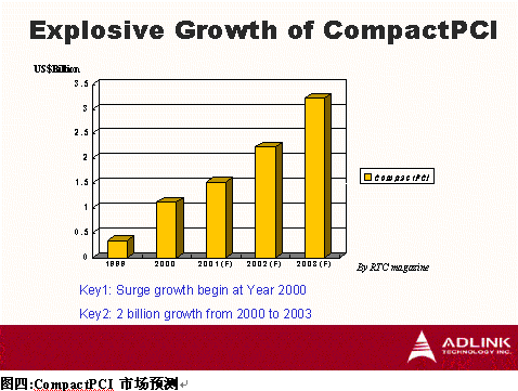 Magazine 估計(jì),CompactPCI市場將由1999年的美金$350 Million成長到2003年的美金$3200 Million,年復(fù)合成長率高達(dá)45.6%,其中又以2002年至2003年最大幅成長。CompactPCI為工業(yè)計(jì)算機(jī)產(chǎn)業(yè)開拓了一個(gè)以往傳統(tǒng)工業(yè)計(jì)算機(jī)無法應(yīng)用的新市場,而CompactPCI需針對(duì)電信等級(jí)應(yīng)用提供高可靠度及達(dá)到嚴(yán)苛高品質(zhì)要求,卻又為傳統(tǒng)工業(yè)計(jì)算機(jī)廠商豎立高進(jìn)入障礙,因此,目前能提供電信級(jí)CompactPCI寬頻通訊平臺(tái)幾為國外廠商,如Motorola、Ziatech、Force