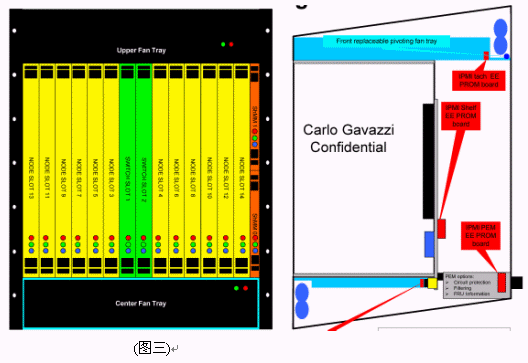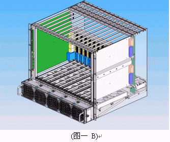 我們可以看到當今市面上已有相關的零件商或系統(tǒng)商開發(fā)出14U或13U,12U的ATCA機箱。就ATCA機箱的型式來說可以分為直立型插卡與橫向型插卡兩種類型。直立式插卡機箱的標準為14槽(參考圖一B),而橫向型機箱因受限于機箱高度,所以視其高度決定槽數的多少。 ATCA的架構主要包括以下部分:正面插槽,RTM,PEM,背板,CMMs,散熱系統(tǒng)。(參考圖一與圖二)