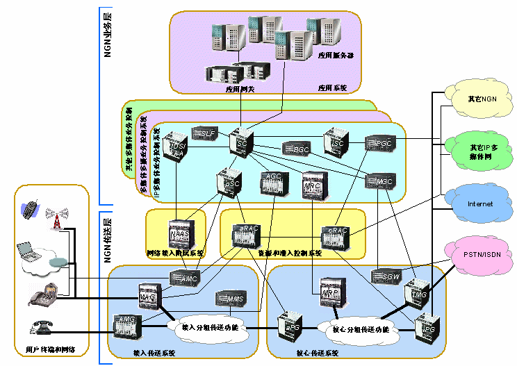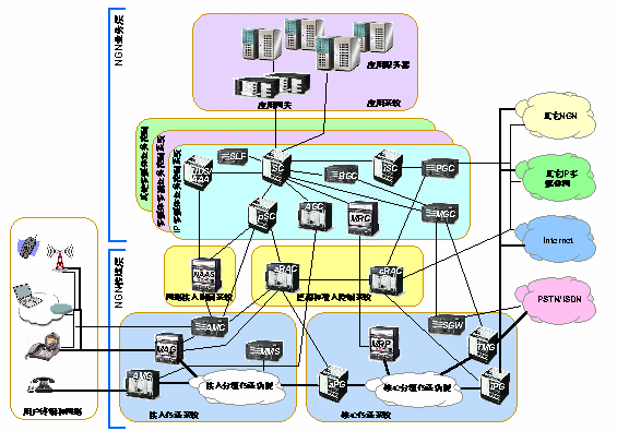 NGN網(wǎng)絡(luò)邏輯上可分為用戶網(wǎng)、接入網(wǎng)和核心網(wǎng)。網(wǎng)絡(luò)的管理界限將NGN劃分為一些不同的NGN域。接入網(wǎng)和核心網(wǎng)可在同一NGN域中,也可以屬于不同的域。域內(nèi)的網(wǎng)絡(luò)拓?fù)湫畔⒖梢詫?duì)外屏蔽。域和域之間的互通將通過(guò)網(wǎng)關(guān)來(lái)完成。NGN支持與現(xiàn)有的網(wǎng)絡(luò)互通,如電話網(wǎng)絡(luò)、蜂窩網(wǎng)絡(luò)、互聯(lián)網(wǎng)等。NGN還支持各種有"NGN意識(shí)"的用戶設(shè)備和現(xiàn)有的無(wú)"NGN意識(shí)"的終端,如模擬電話機(jī)、傳真機(jī)、ISDN終端等。這些互通都通過(guò)網(wǎng)關(guān)來(lái)完成。NGN的網(wǎng)關(guān)主要包括多媒體接入網(wǎng)關(guān)、接入媒體網(wǎng)關(guān)、中繼媒體網(wǎng)關(guān)、分組網(wǎng)關(guān)和信令網(wǎng)關(guān)。