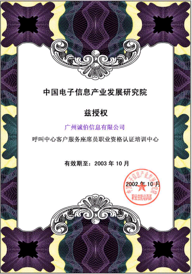 近日,廣州誠伯信息有限公司正式成為信息產(chǎn)業(yè)部電子行業(yè)技能鑒定指導(dǎo)中心授權(quán)的"呼叫中心職業(yè)標準體系"培訓單位。