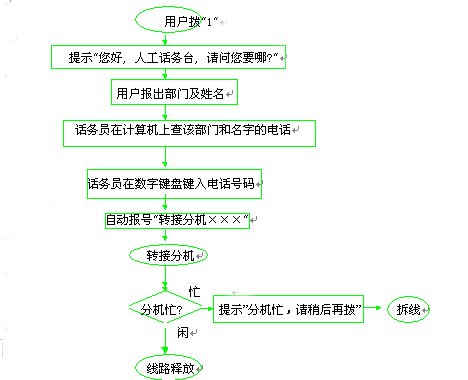 由于本系統(tǒng)除了具有自動接續(xù)功能外, 當用戶不知道分機號時可按部門名稱自動查號,這樣大部分的來話都可以實現(xiàn)自動接續(xù)。當少數(shù)來話需要人工查詢時, 人工輔助查號可以幫助話務員按部門的歸屬查找到所需電話, 系統(tǒng)自動報號及轉(zhuǎn)接, 話務員無需記電話號碼, 只需按幾下數(shù)字鍵, 其它一切均由電腦完成。系統(tǒng)的統(tǒng)計功能能統(tǒng)計出所有自動、人工的來話接續(xù)數(shù)據(jù), 按照電話頻率排列用戶的電話號碼, 便于話務員查找。