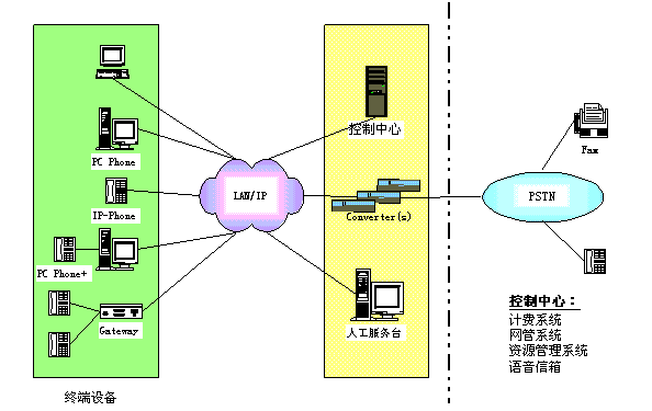 控制中心:包括資源管理系統(tǒng)、計費系統(tǒng)、網(wǎng)管系統(tǒng)、語音信箱。 其中,資源管理系統(tǒng)主要執(zhí)行地址翻譯、權(quán)限控制、路由管理等功能;計費系統(tǒng)主要完成計費及結(jié)算功能;網(wǎng)管系統(tǒng)完成對網(wǎng)絡(luò)及IP PBX運(yùn)行的維護(hù)管理
